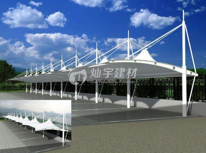 膜結構車棚廠家生產的膜結構車棚面料采用國產PVC涂層膜布制作而成 有自己清潔功能。在建筑形式與設計方法上不斷改變。從材料采購、加工、制作到產品運輸、現場施工、安裝的全過程都受到嚴格的質量控制。就是材質為膜結構的車棚。